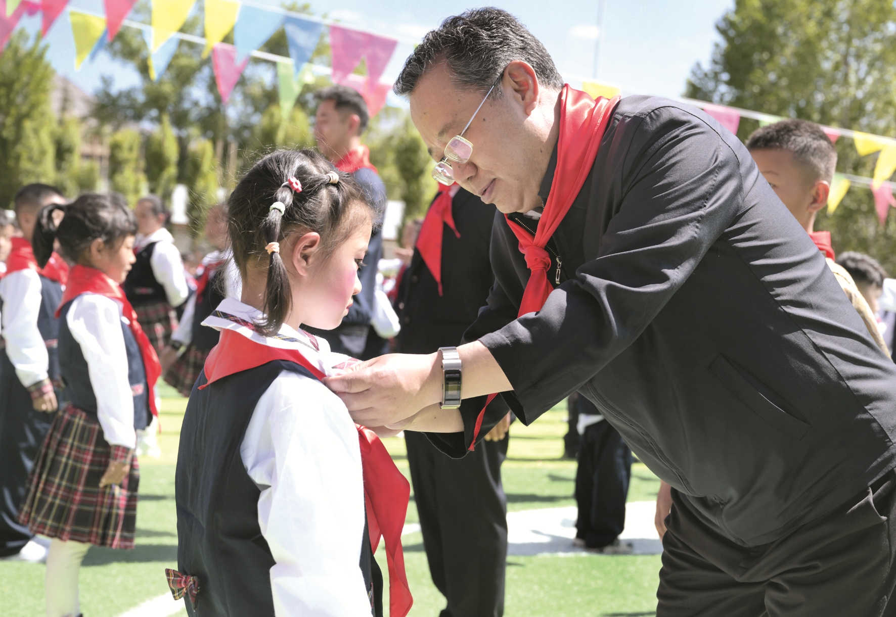 6月1日,西藏自治區(qū)黨委常委、市委書記普布頓珠來到市實驗小學(xué)、實驗幼兒園走訪慰問。這是普布頓珠在市實驗小學(xué)為少先隊新隊員授紅領(lǐng)巾。拉薩融媒記者 貢覺群培攝