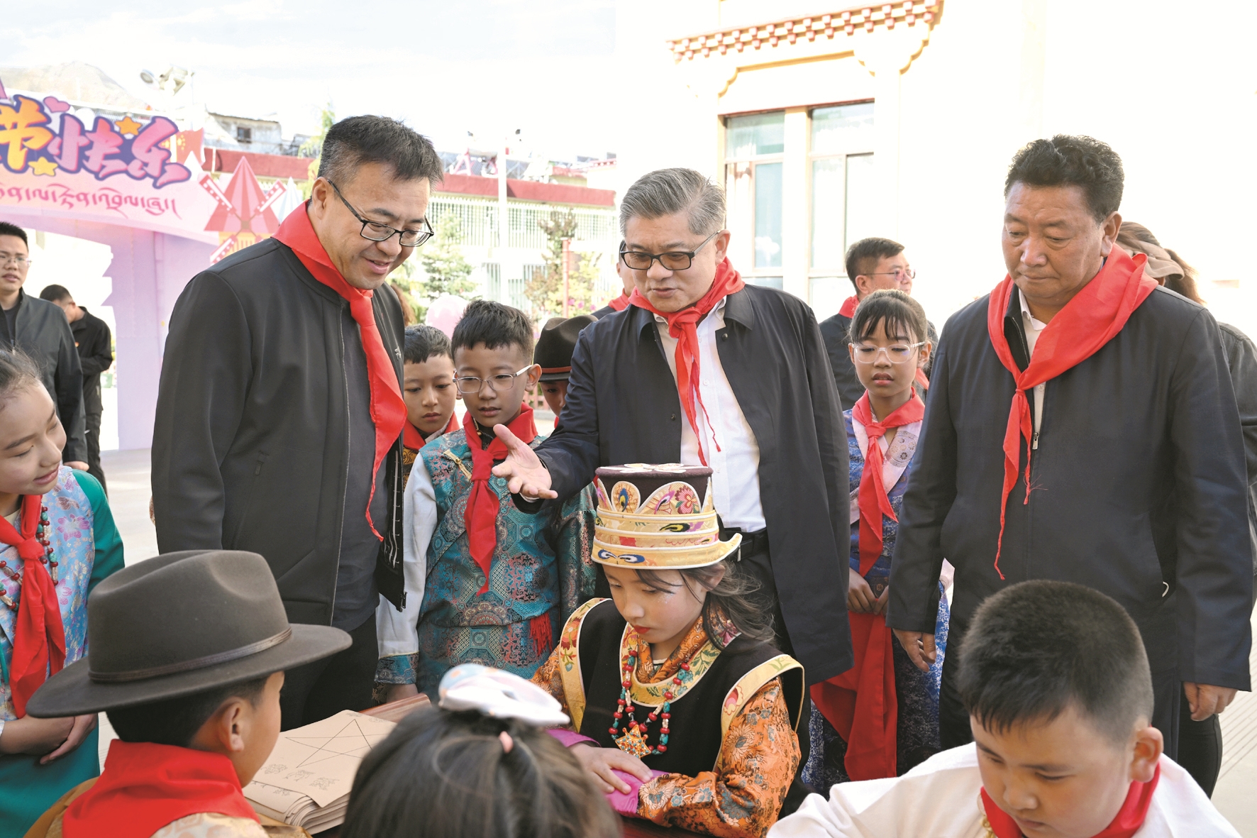 拉薩市第一小學(xué)是西藏和平解放后拉薩開辦的第一所公立小學(xué),建校70年來,為新西藏各項建設(shè)事業(yè)輸送了萬千棟梁人才。來到拉薩市第一小學(xué)江蘇路分校,身著民族服飾的藏族小姑娘南杰拉措為王強一行系上鮮艷的紅領(lǐng)巾,并熱情帶領(lǐng)王強一行走向校園。