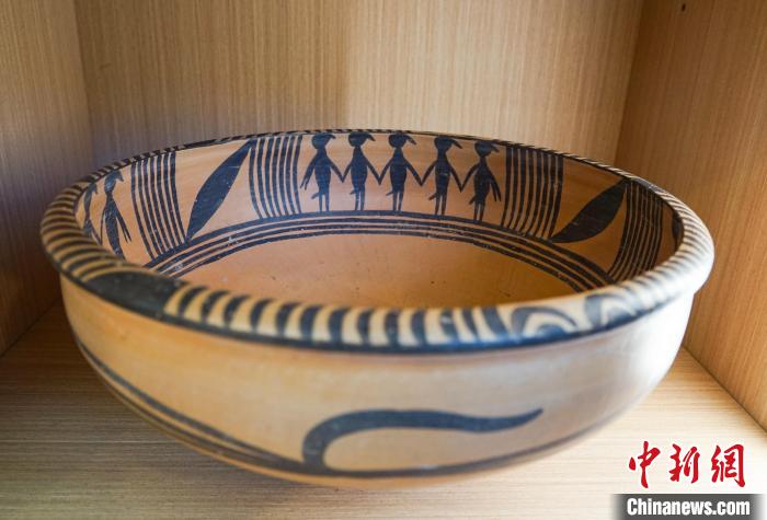圖為中心內(nèi)展出的仿制文物、出土于青海大通上孫家寨的馬家窯時(shí)期的舞蹈紋彩陶盆。馬銘言攝