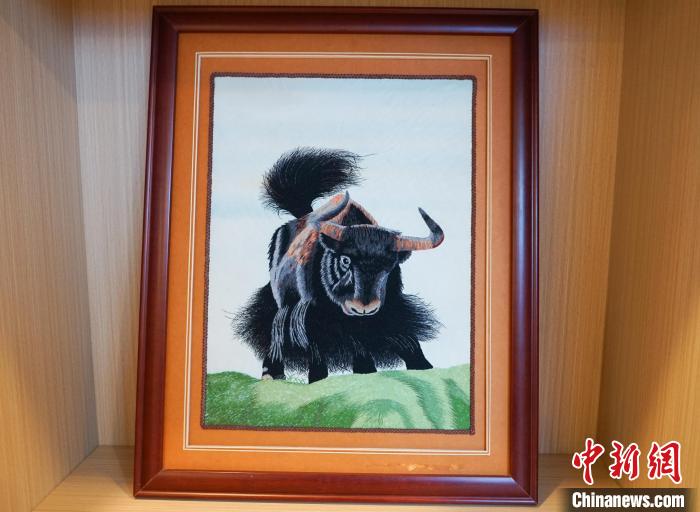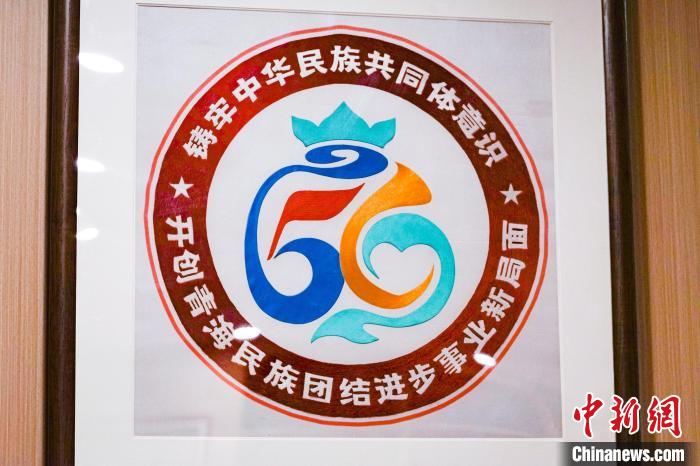 圖為中心內(nèi)展示的青海省民族團(tuán)結(jié)進(jìn)步形象標(biāo)識刺繡作品。馬銘言 攝