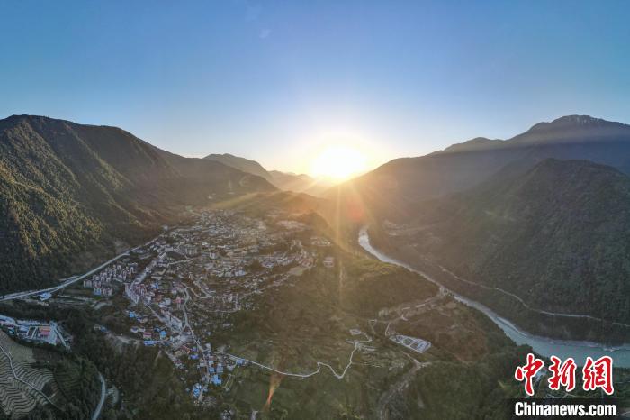 圖為12月19日傍晚,西藏林芝市墨脫縣城日落風光,畫面右側為雅魯藏布江。(無人機畫面)中新社記者 江飛波 攝