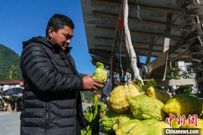 12月19日,48歲的門巴族次仁旺加在家門口馬路邊碼放大檸檬,這些墨脫特產主要向路過的游客銷售。中新社記者 江飛波 攝
