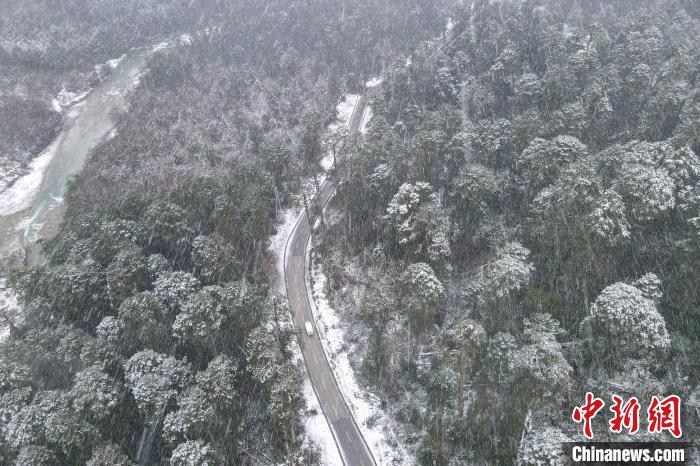 12月18日,西藏墨脫扎墨公路,一輛車迎著大雪去往墨脫縣城方向。(無(wú)人機(jī)畫面)中新社記者 江飛波 攝