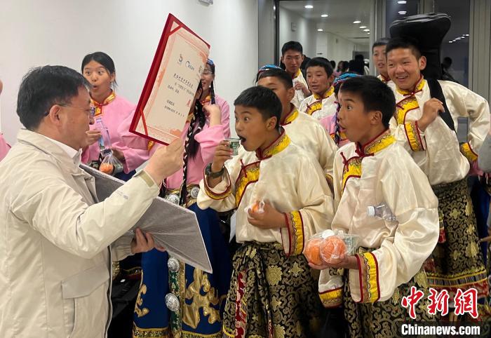 圖為果洛州青少年管樂團的成員們領(lǐng)取獲獎證書?!暵?攝