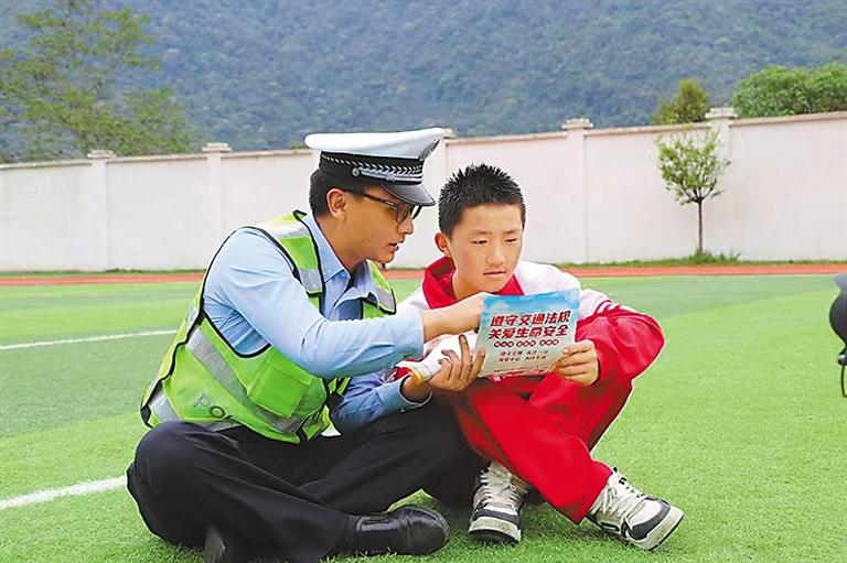 圖為交警向?qū)W生講解交通安全知識(shí)。記者 彭琦 攝