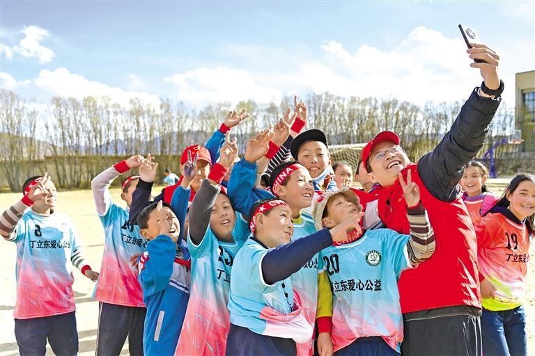圖為丁立東愛心救助網(wǎng)志愿者與芒熱鄉(xiāng)中心小學(xué)學(xué)生合影。記者 扎西頓珠 攝