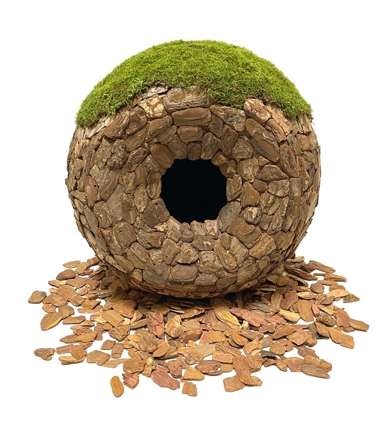 嘎瑪次仁的作品聚焦生態(tài)環(huán)境,作品《意象·自然》,是對“自然”理解的一種概念性的抽象表達。其形式上為一個中空球形裝置,表面為拼貼的樹皮,頂部種植有苔蘚。正面的部分區(qū)域內陷,中間為一孔洞,為了更凸顯出洞中的“黑暗”與“未知”,內部涂有特殊啞光涂料。為了體現(xiàn)出“生命感”,他在作品內部安裝了感應發(fā)聲裝置,感知到人靠近后會發(fā)出輕微的心跳聲。