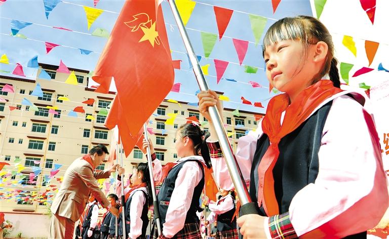 5月30日,拉薩市在實驗小學東城分校舉行以“紅領巾愛祖國”為主題的一年級新隊員入隊儀式暨“紅領巾獎章”五星章頒章儀式。儀式現(xiàn)場,老隊員們鄭重地為新隊員佩戴紅領巾,大隊輔導員帶領新老隊員宣讀入隊誓詞,隊員們激情唱響《我們是共產(chǎn)主義接班人》,嘹亮的歌聲在校園回蕩。