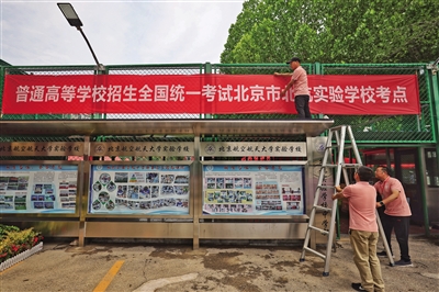 6月6日,記者在北京航空航天大學(xué)實(shí)驗(yàn)學(xué)校中學(xué)部(簡(jiǎn)稱“北航實(shí)驗(yàn)學(xué)?!保┛键c(diǎn)看到,學(xué)校西門處已懸掛起高考考點(diǎn)橫幅、考場(chǎng)布置已就位,校園內(nèi)放置了多個(gè)溫馨的提示語(yǔ)標(biāo)牌。據(jù)悉,該校是今年新增高考考點(diǎn)之一,承接來(lái)自9所學(xué)校277名考生的高考組考任務(wù)。此外,記者還探訪了北京高考人大附中經(jīng)開(kāi)學(xué)校考點(diǎn)