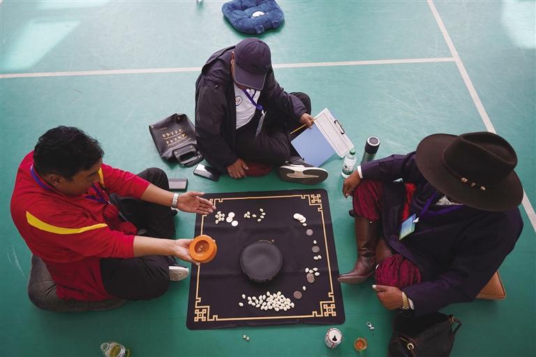 當日,“吉韌”“秀茲”等項目一同開賽。 “吉韌”也叫藏式克郎球,是藏族的一種彈指運動。比賽在一張邊長約1米的正方形木桌球臺上進行,球臺四角有4個小洞,黑、白兩種扁圓形球子各9個,另有1個紅色球子放置在球臺中心,1個白色母球供雙方彈擊球子所用。