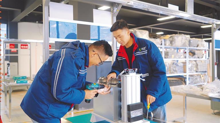 在西藏清匠電器科技有限公司生產(chǎn)車間,來自多頗章鄉(xiāng)嘎東團(tuán)結(jié)新村六組村民朗嘎崔成正和與他一同入職的員工學(xué)習(xí)安裝制氧機(jī)。2023年大學(xué)畢業(yè)以來,朗嘎崔成一直待業(yè),偶爾打零工補(bǔ)貼家用,今年3月,嘎東團(tuán)結(jié)新村就業(yè)服務(wù)站為他爭取了這個就業(yè)崗位。