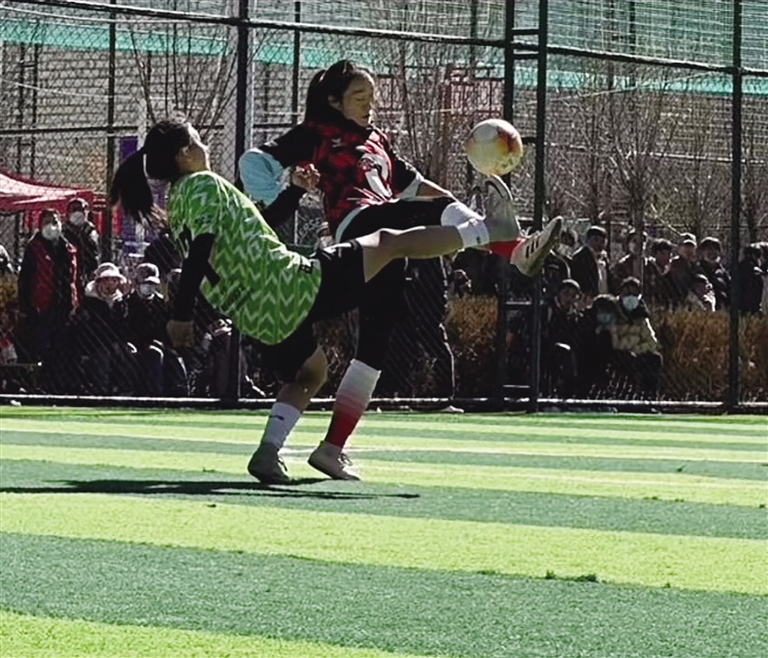 在徐州幼兒師范高等??茖W(xué)校操場上,來自西藏拉薩的藏族女孩米央正在和朋友練習(xí)傳球、盤帶、變向、撥球……每逢課余時間,米央背著挎包,穿著足球裝備,出現(xiàn)在學(xué)校綠茵場上,赴一場午后球賽。這天踢完全場后的米央在場邊休息片刻,若有所思地翻看著手機里訓(xùn)練視頻?!斑@是暑假期間,在拉薩踢比賽的視頻,當時我們踢得很盡興,現(xiàn)在很期待寒假繼續(xù)在拉薩踢比賽?!泵籽敫嬖V記者。顯然,她很想念在拉薩踢球的時光。