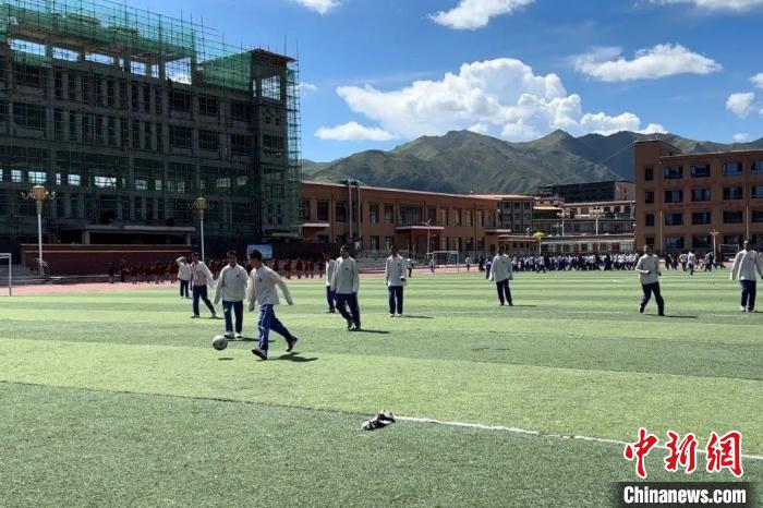 碌曲縣藏族中學的操場上,孩子們正在踢足球。臧赫 攝