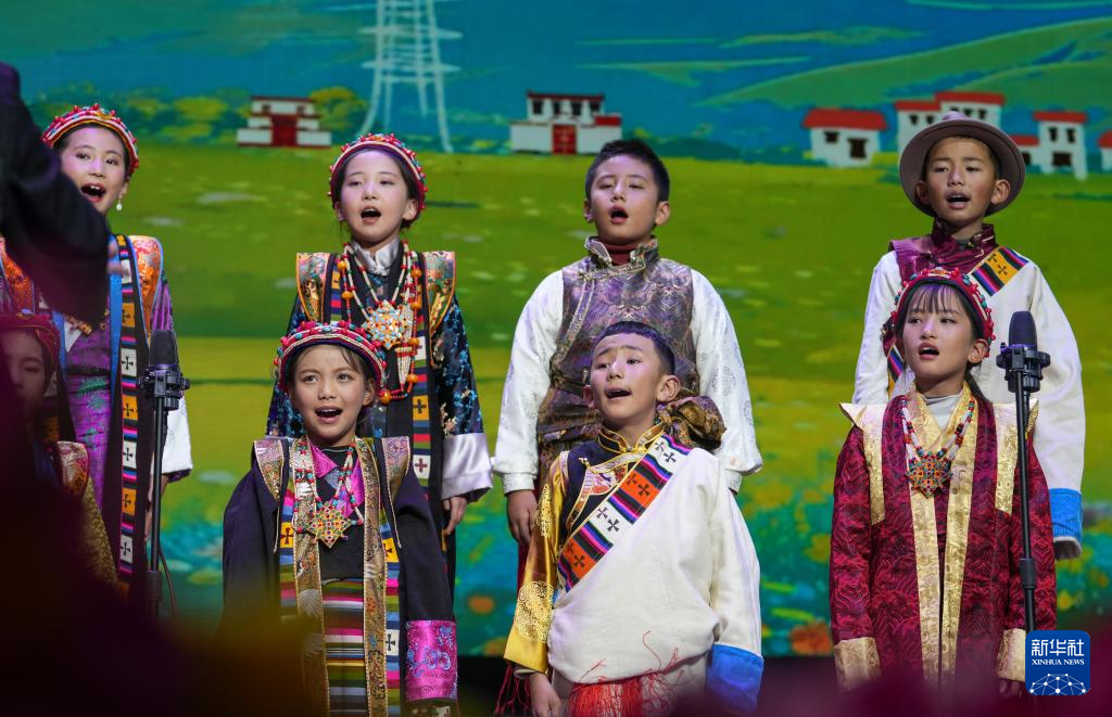 12月28日晚,西藏珠峰少年合唱團學員代表合唱歌曲《快快走唱首歌》。新華社記者 晉美多吉 攝