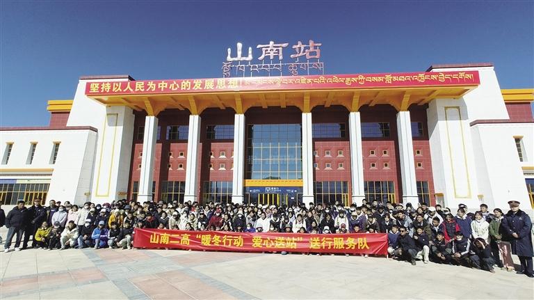 山南市第二高級(jí)中學(xué)“暖冬行動(dòng) 愛(ài)心送站”送行服務(wù)隊(duì)和學(xué)生們合影。 圖由格桑央金提供