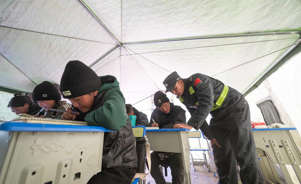 今年22歲的劉鑫磊,是西藏邊檢總站日喀則邊境管理支隊的一名新警。地震發(fā)生后,他和同事第一時間趕赴災區(qū)救援。在救援工作進入過渡期安置階段后,他們排查發(fā)現(xiàn),雜村、嘎布村和玉白村共有6名高三學生、8名初三學生。這些學生正處于備考關(guān)鍵期,而地震讓附近的幾個村子遭受重創(chuàng),房屋倒塌,孩子們的課本和練習冊幾乎全部被毀。面對接連不斷的余震和考試的壓力,這些學生需要的不只是生活上的幫助。
