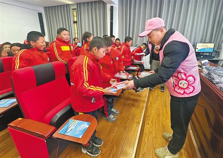 圖為工作人員給孩子們發(fā)放相關(guān)宣傳手冊。 拉巴次仁 記者 旦增蘭澤 攝