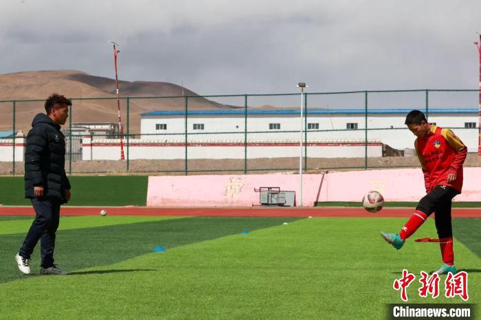 4月13日,曲麻萊青少年足球訓(xùn)練基地專(zhuān)職教練才仁達(dá)杰(左)指導(dǎo)球員訓(xùn)練。薛蒂 攝