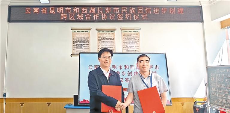 圖為昆明市與拉薩市民族團結進步創(chuàng)建跨區(qū)域合作協(xié)議簽約儀式現(xiàn)場。