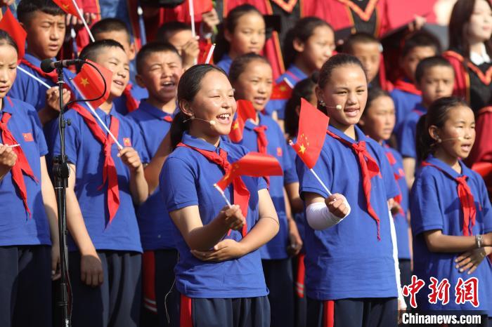 6月23日,中國人民大學(xué)2025年畢業(yè)典禮現(xiàn)場,措果鄉(xiāng)中心小學(xué)的孩子們與人大畢業(yè)生們小手牽大手,相伴而立,共同唱響《萬疆》。主辦方供圖
