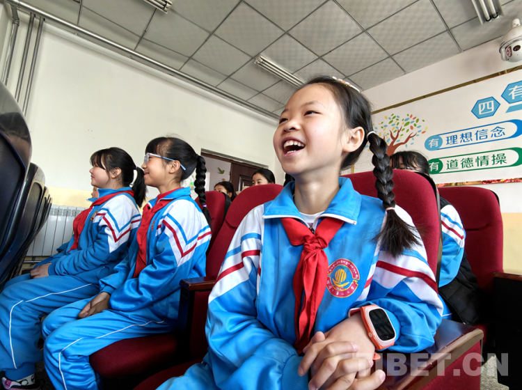 圖為4月23日,西藏自治區(qū)新華書店在拉薩市城關(guān)區(qū)海淀小學(xué)開展的“享受閱讀 讓夢(mèng)飛翔”閱讀校園行活動(dòng)互動(dòng)環(huán)節(jié),有趣的互動(dòng)把小學(xué)生給逗樂了 攝影:次旦拉姆