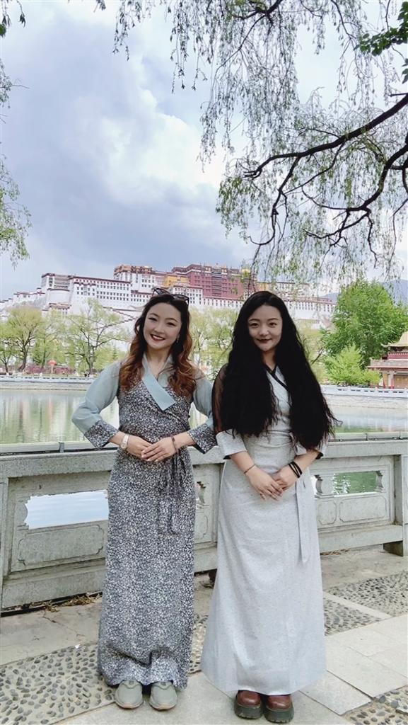 八廓街內(nèi),布宮圍墻邊,帕崩崗桃花樹下……游走在拉薩各個(gè)景點(diǎn),你會發(fā)現(xiàn)眾多身著藏裝的漂亮姑娘,她們大多是來自全國各地的游客。藏裝布料精美、顏色亮麗,樣式傳統(tǒng)或新穎,配上頭飾耳飾,衣香鬢影、搖曳生姿。她們穿著藏裝賞景、拍照留念,亦成為別人眼中的風(fēng)景。