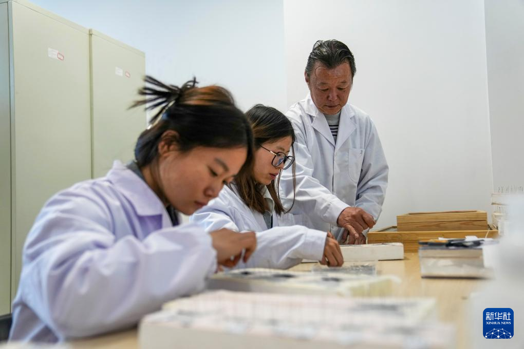 在位于拉薩的西藏自治區(qū)高原生物研究所,達娃(右)和同事查看采集到的昆蟲標本(4月22日攝)。新華社記者 晉美多吉 攝