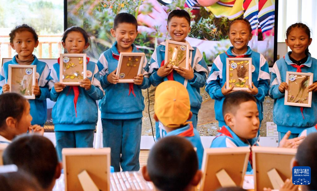 8月15日,拉魯小學的學生在拉魯濕地國家級自然保護區(qū)管理局科普小教室里向大家展示優(yōu)秀植物標本。新華社記者 張汝鋒 攝