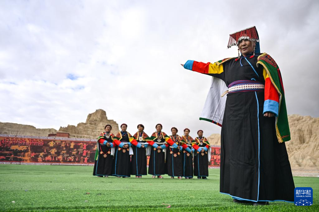 在西藏阿里地區(qū)札達(dá)縣古格王國(guó)遺址腳下,自治區(qū)級(jí)“宣舞”非遺傳承人央金(右)介紹“宣舞”(9月11日攝)。新華社記者 孫瑞博 攝 ??