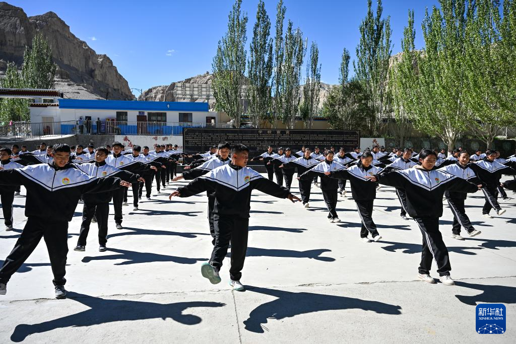在西藏阿里地區(qū)札達(dá)縣九年一貫制學(xué)校,學(xué)生們跳起融入“宣舞”特色的課間操(9月10日攝)。新華社記者 孫瑞博 攝