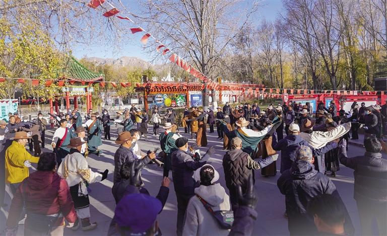 無(wú)論清晨還是傍晚,在拉薩的各個(gè)廣場(chǎng)和公園,都能看到聚集在一起跳鍋莊的群眾,他們以舞蹈為紐帶,在或歡快或緩慢的節(jié)奏中,共同分享生活的樂(lè)趣并收獲了友誼?!耙婚_(kāi)始因?yàn)椴粫?huì)、害羞等原因,不敢跟著人群跳,后來(lái)有兩個(gè)那曲的妹妹,主動(dòng)和我說(shuō)話還教了我?guī)讉€(gè)舞步,讓我很快融入進(jìn)來(lái)。我們現(xiàn)在是朋友,假期還約好去她們老家玩兒。”張鳳鳳說(shuō)。剛才在場(chǎng)內(nèi)跳的起勁兒的拉薩市民次珍說(shuō):“我以前不是很喜歡廣場(chǎng)舞,覺(jué)得就是‘大媽’們的健身操,后來(lái)在區(qū)外上學(xué)時(shí)看到當(dāng)?shù)氐膹V場(chǎng)舞場(chǎng)地有人在跳鍋莊,就覺(jué)得很驚喜。畢業(yè)回來(lái)發(fā)現(xiàn)拉薩大大小小的廣場(chǎng)上跳的鍋莊舞很受歡迎,更開(kāi)心自己也參與進(jìn)來(lái)了?!?/p>