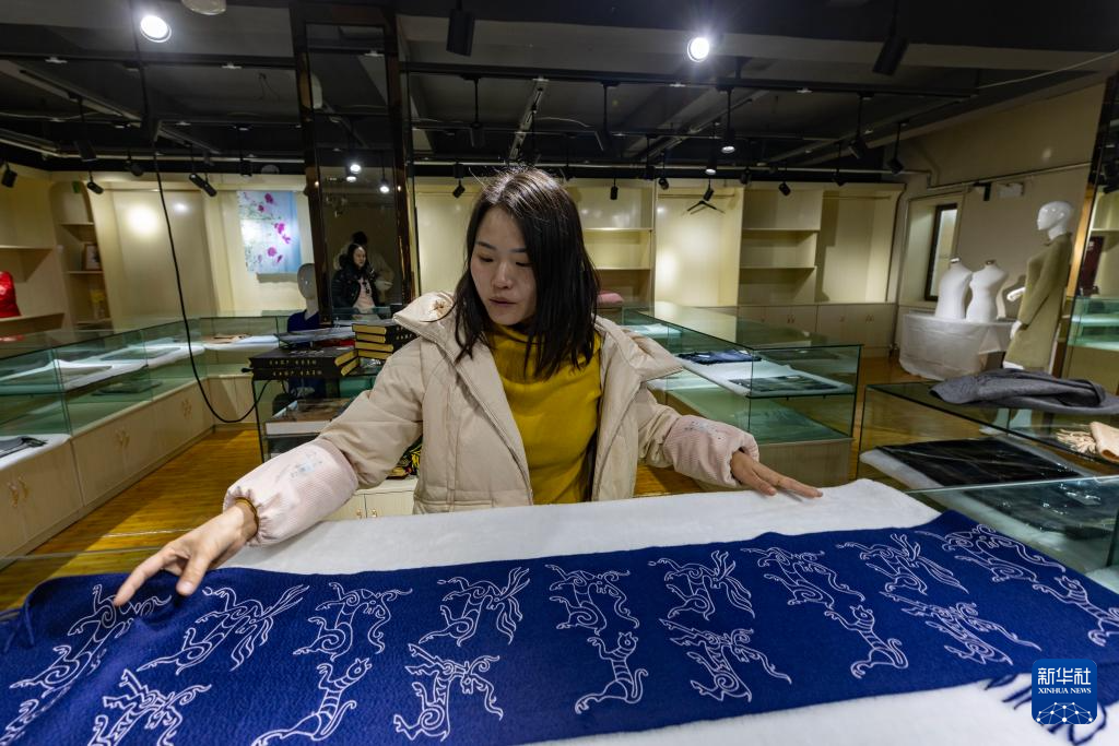 日土縣白山羊絨產(chǎn)業(yè)展示中心的工作人員在展示印有日土巖畫圖案的“指環(huán)披肩”(11月16日攝)。新華社記者 姜帆 攝 ??