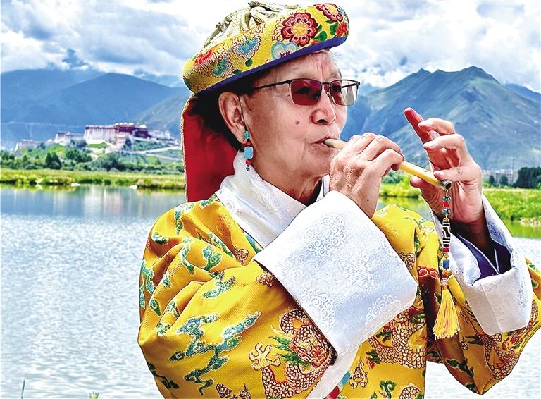 鷹笛是來自于大自然的樂器,吹奏出的每個音符蘊含了大自然的靈性。笛聲如同在天空中任意翱翔的雄鷹,高亢且空靈,似乎在訴說著千年的傳奇。今年74歲的次旦,是國家一級演奏員,也是自治區(qū)級藏族鷹笛藝術(shù)非物質(zhì)文化遺產(chǎn)代表性傳承人。次旦老師從小和鷹笛結(jié)下了不解之緣,并立志要將藏族鷹笛藝術(shù)發(fā)揚光大。如今,退休在家的次旦老師依舊奔忙在傳播藏族鷹笛藝術(shù)的工作中,為傳承“非遺”貢獻著自己的力量。