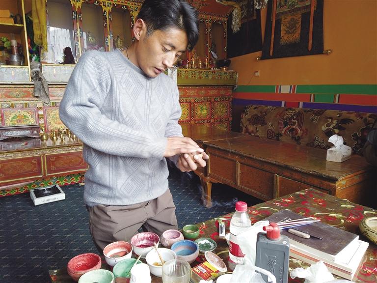 近日,記者走進尼瑪次仁的家,首先映入眼簾的是嶄新的兩層藏式小樓房。在干凈整潔的院內(nèi),年邁的爺爺奶奶正悠閑地曬著冬日的暖陽,尼瑪次仁則在二樓安靜地繪畫唐卡。他目光專注,正拿著畫筆在一幅唐卡上一筆一畫地描摹著。