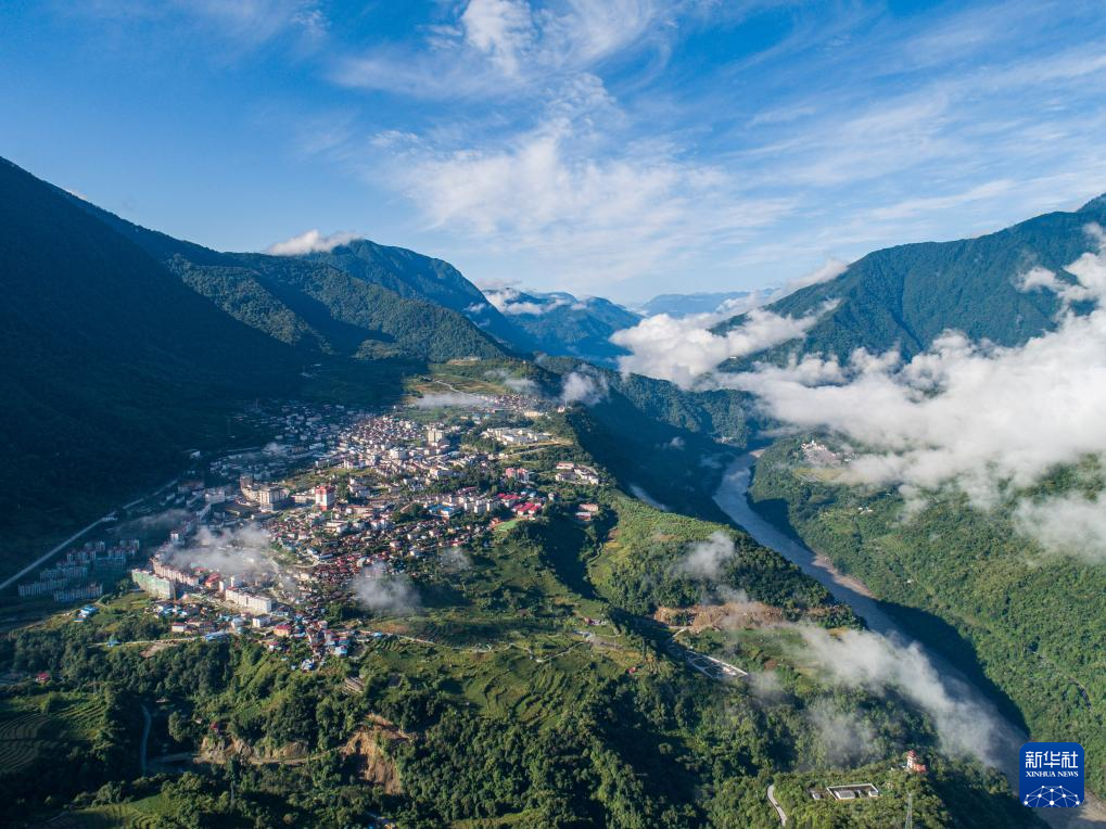 2023年10月13日拍攝的墨脫縣城(無人機(jī)照片)。西藏林芝市墨脫縣地處雅魯藏布江下游、喜馬拉雅山脈東端南麓,平均海拔約1200米。獨特的地理環(huán)境造就了濕潤多雨的氣候特征,城鎮(zhèn)坐落在高山深谷之中,掩映于云海叢林之間,風(fēng)景秀美。新華社記者 孫非 攝