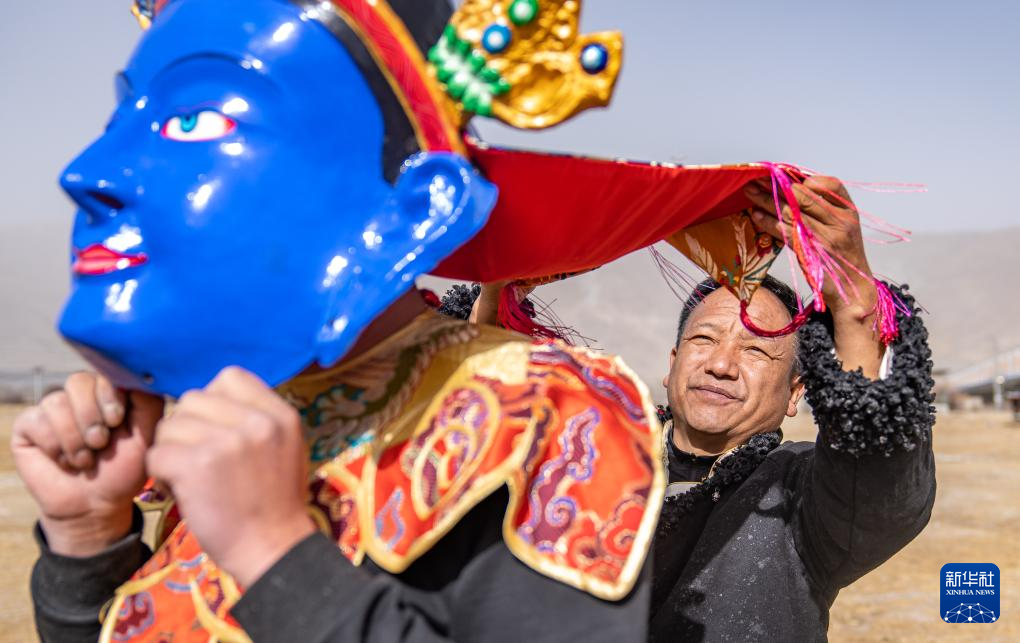 12月9日,西洛(右)在合作社門前的空地上和同事一起檢查做好的西藏傳統(tǒng)面具。新華社記者 丁增尼達 攝 ??