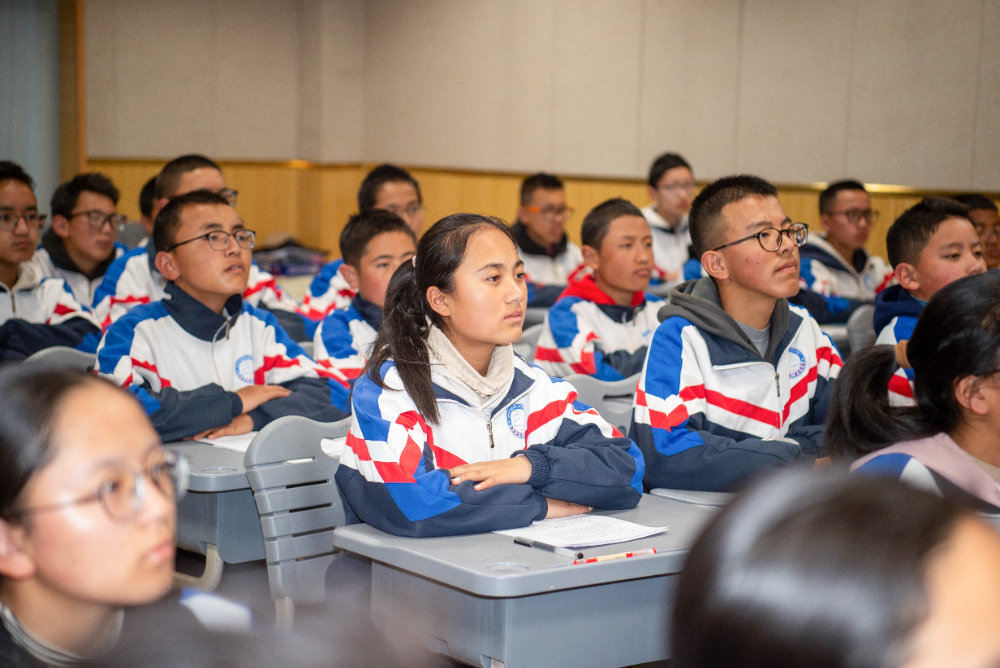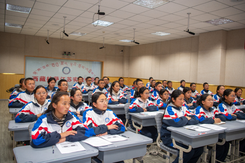 4月11日,拉薩江蘇實驗中學(xué)的學(xué)生在認真聽江蘇省如東高級中學(xué)的宣講。新華網(wǎng) 旦增努布 攝?