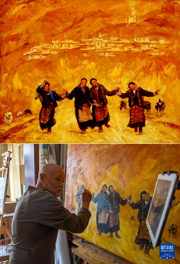?這是一張拼版照片,上圖為:張鷹的代表作之一《酒歌》(受訪者供圖) ;下圖為:張鷹在拉薩的畫室重繪自己的代表作《酒歌》(新華社記者姜帆攝5月13日攝)。新華社發(fā)??