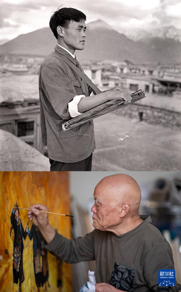 這是一張拼版照片,上圖為:1973年,初到西藏不久的張鷹在八廓街房頂上寫生(受訪者供圖);下圖為:張鷹在拉薩的畫室作畫(新華社記者姜帆攝5月13日攝)。新華社發(fā)??
