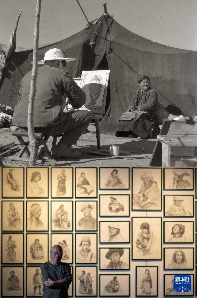 ?這是一張拼版照片,上圖為:1983年冬,張鷹在尼木縣寫生(受訪者供圖);下圖為:張鷹在西藏美術(shù)館自己畫展上的“素描墻”前(新華社記者姜帆攝5月13日攝)。新華社發(fā)