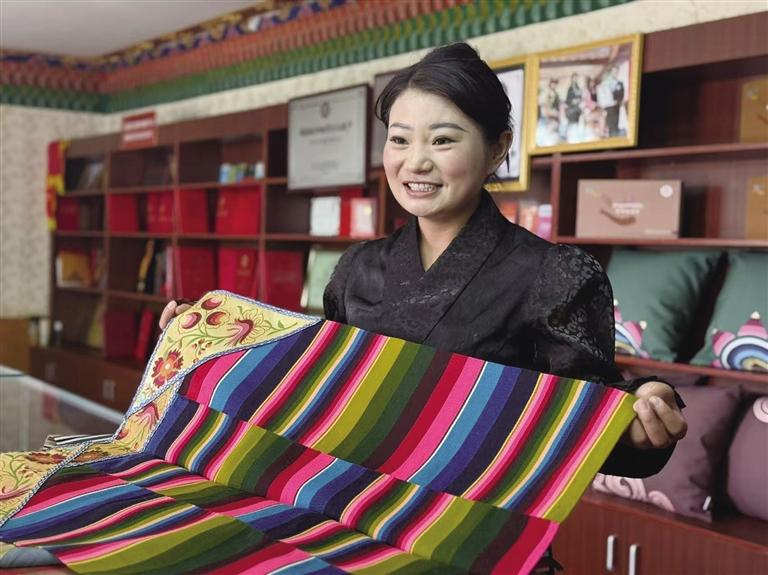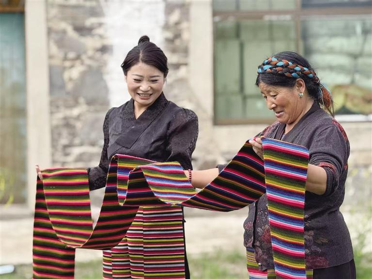 “好的技藝和原料是基礎(chǔ),創(chuàng)新的產(chǎn)品是敲門磚,走好這兩步,再打響知名度,我們的經(jīng)濟(jì)效益才能更上一層樓。”為了讓更多人了解邦典,旦增卓嘎帶著合作社的產(chǎn)品頻繁亮相藏博會(huì)等平臺(tái),用現(xiàn)場(chǎng)編織演示和文化講解,讓世界讀懂“彩虹圍裙”的故事。