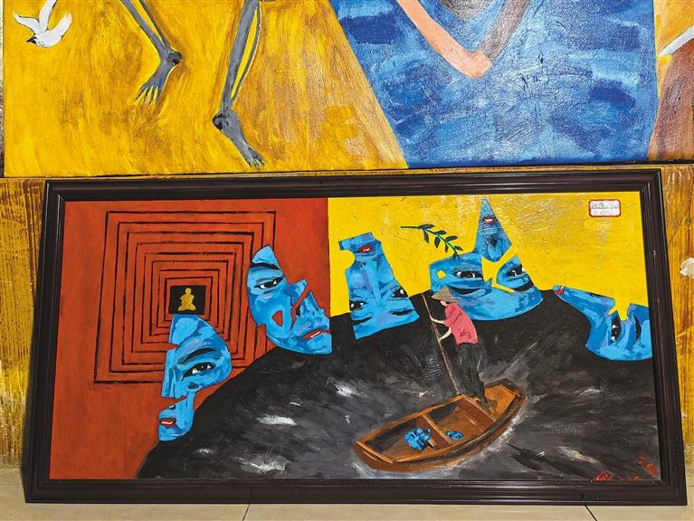 院墻之外,最近的煙火氣是馬路旁一個樸素的藏餐館。小院內部,生活的痕跡被壓縮到極致,只有一方茶臺承載著休憩與待客的使命。其余區(qū)域,則被畫作、書籍和創(chuàng)作工具占據(jù)。