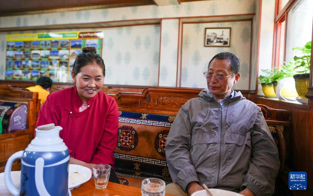 洛桑麥朗(右)和畢業(yè)學(xué)生在甜茶館吃午飯時回答學(xué)生的問題(8月15日攝)。新華社記者 晉美多吉 攝