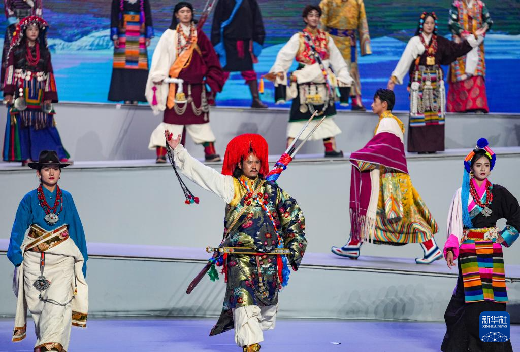 模特在首屆西藏“衣脈相承”服飾文化周走秀現(xiàn)場展示傳統(tǒng)服飾(2025年1月5日攝)。新華社記者 晉美多吉 攝