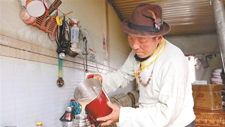 圖為日喀則市定結縣郭加鄉(xiāng)切村村民拉巴在用中央代表團送來的酥油茶壺打酥油茶。本報通訊員 扎西卓嘎 攝