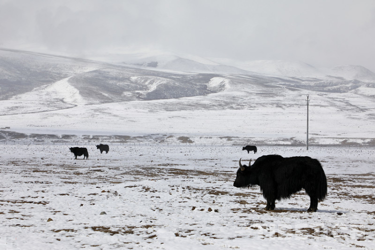 時已暮春,但在高寒牧區(qū)天然草場,草還沒發(fā)芽,洛絨赤乃只好讓牛在雪地里啃冬天留下的枯草。雖然定居點(diǎn)牛棚里有儲存的人工飼草,但還是要備不時之需,因?yàn)榇合闹贿€會經(jīng)常下雪,也是牦牛最難熬的時節(jié)。