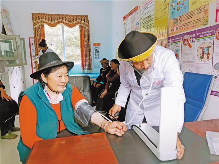 連日來(lái),林芝米林縣各鄉(xiāng)鎮(zhèn)衛(wèi)生院醫(yī)務(wù)人員深入轄區(qū)村社開(kāi)展醫(yī)療服務(wù)工作。 圖為米林縣羌納鄉(xiāng)衛(wèi)生院醫(yī)務(wù)人員在為村民進(jìn)行體檢。 記者 張猛 攝