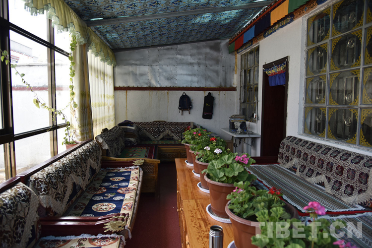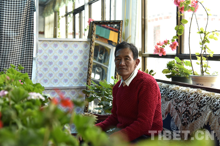 采訪中,印象最深的是索南益西家的那些花。一株三角梅放在陽光房的窗臺(tái)上,陽光照耀下,明媚亮眼。海棠花最多,扦插不久的海棠花并不高,陽光房的桌子上有六七盆,開著或紅或粉或白的花。還有一盆吊蘭,藤蔓隨著繩子攀爬,向屋頂延伸。