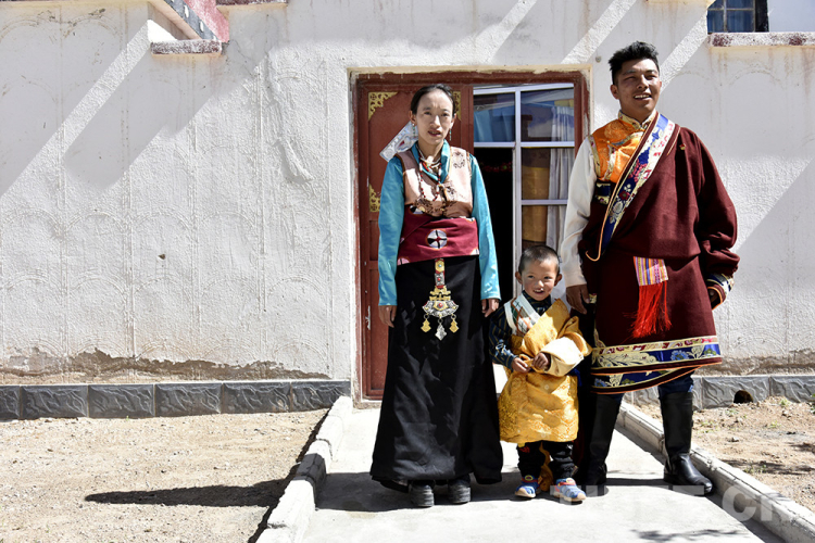 圖為西藏自治區(qū)阿里地區(qū)改則縣圓夢(mèng)新居易地扶貧搬遷點(diǎn)居民扎西頓珠和妻子以及小兒子在家門前合影 攝影:王媛媛
