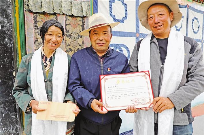 那嘎村黨委書記嘎瑪扎西(中)為脫貧戶次仁達(dá)瓦一家頒發(fā)榮譽(yù)證書。